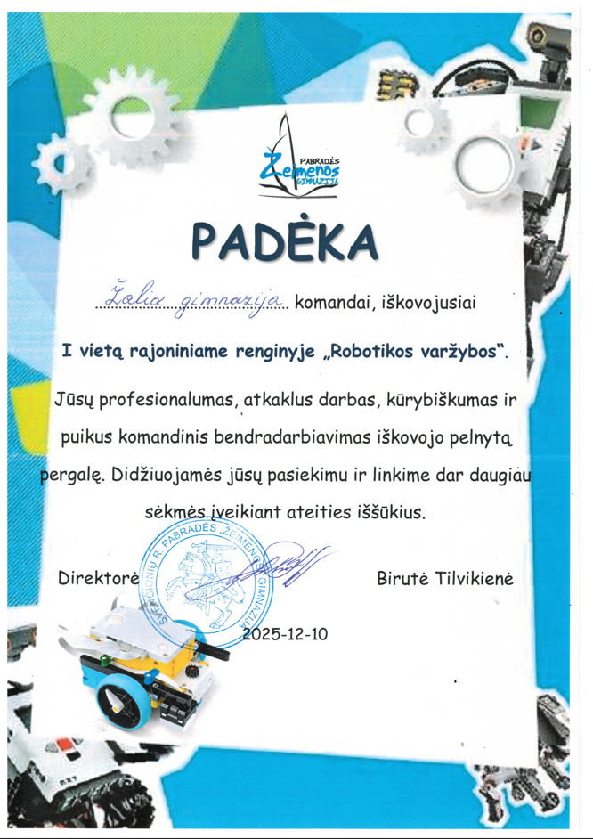 Gruodžio 10 d. Švenčionių Zigmo Žemaičio gimnazijos 5–8 klasių mokinių komanda dalyvavo rajoniniame renginyje „Robotų varžybos“. Renginį organizavo Pabradės „Žeimenos“ gimnazijos informatikos mokytojos E. Čepulkovskienė ir O. Pabiaržina. Tai buvo labai prasminga, įtraukianti edukacija, kupina gerų emocijų, kūrybiško ir komandinio darbo.