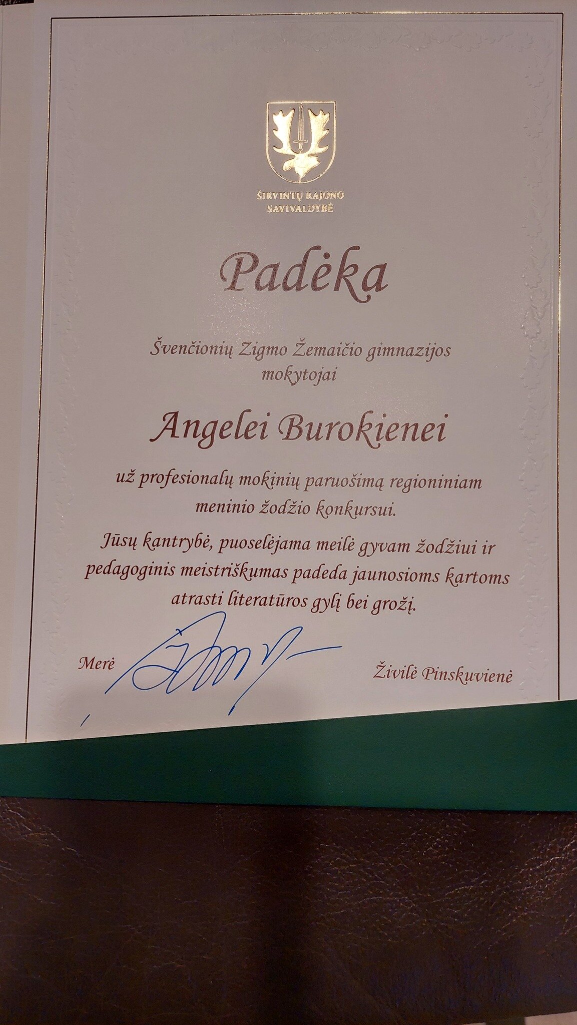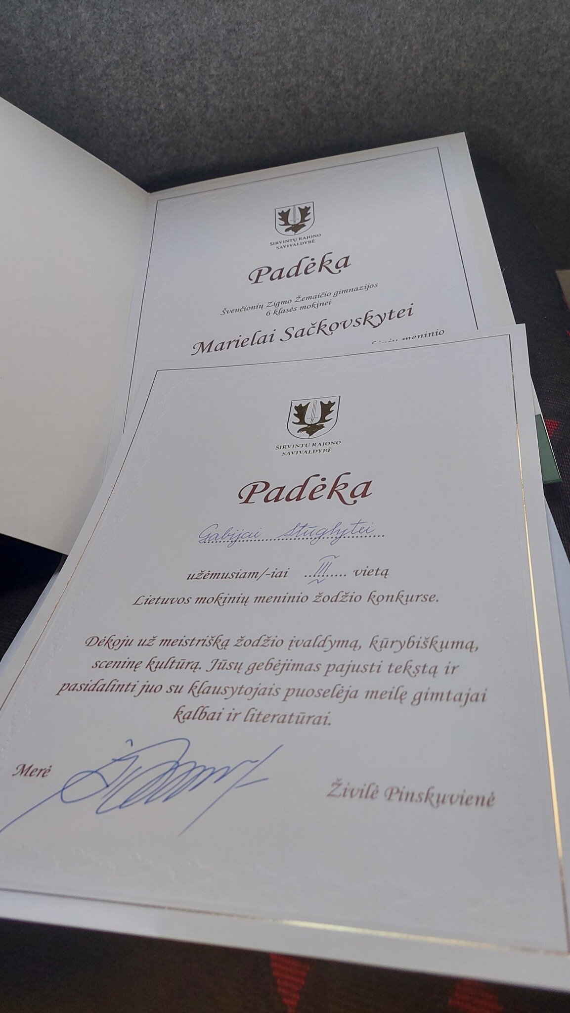 Didžiuojamės mokinių pasiekimais ir linkime Marielai bei Gabijai neprarasti drąsos kalbėti, jausti ir kurti. Tegul meninis žodis ir toliau būna jų saviraiškos būdas, įkvėpimo šaltinis ir kelias į prasmingus kūrybinius atradimus, o meilė gimtajai kalbai lydi kiekviename žingsnyje.