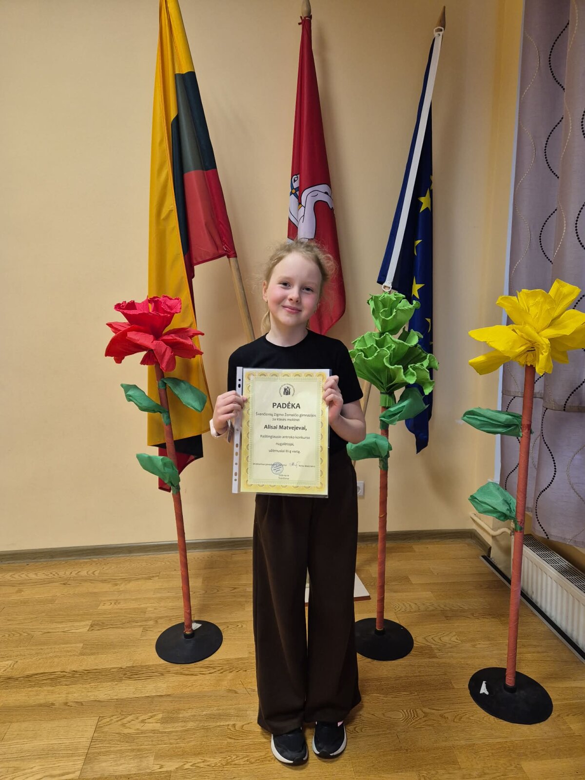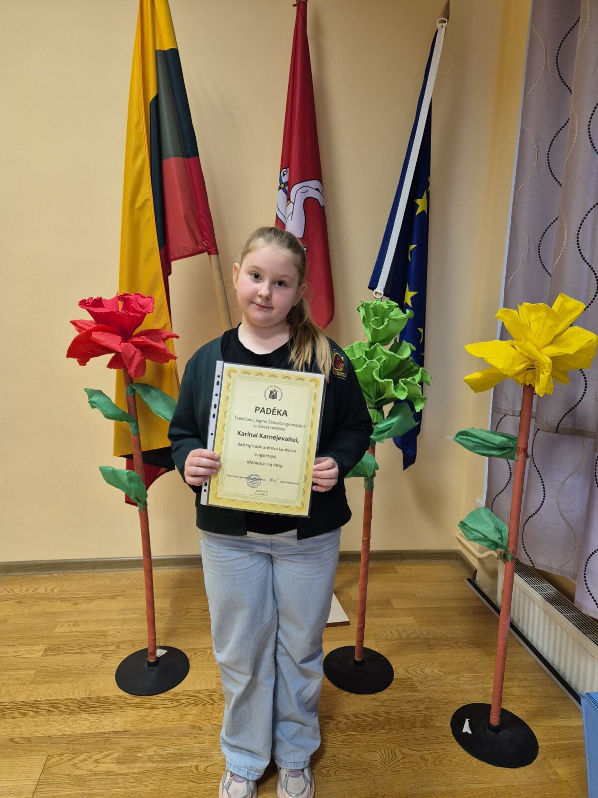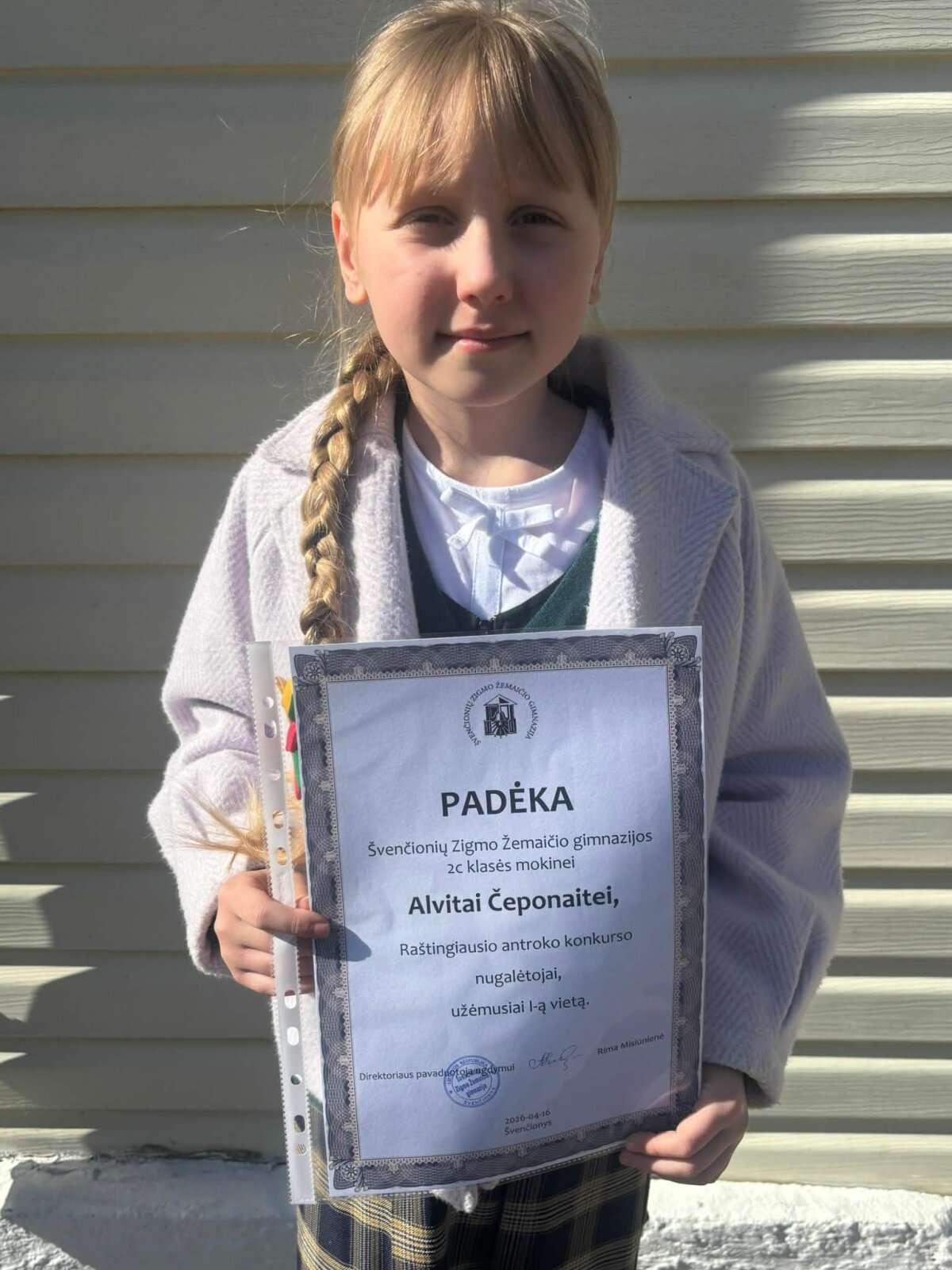 Džiaugiamės puikiais rezultatais! 2c klasės mokinė Alvita Čeponaitė parašė diktantą be klaidų ir užėmė pirmąją vietą. Antroji vieta atiteko 2c klasės mokinei Karinai Karnejevaitei, o trečiąją vietą pelnė 2a klasės mokinė Alisa Matvejeva.