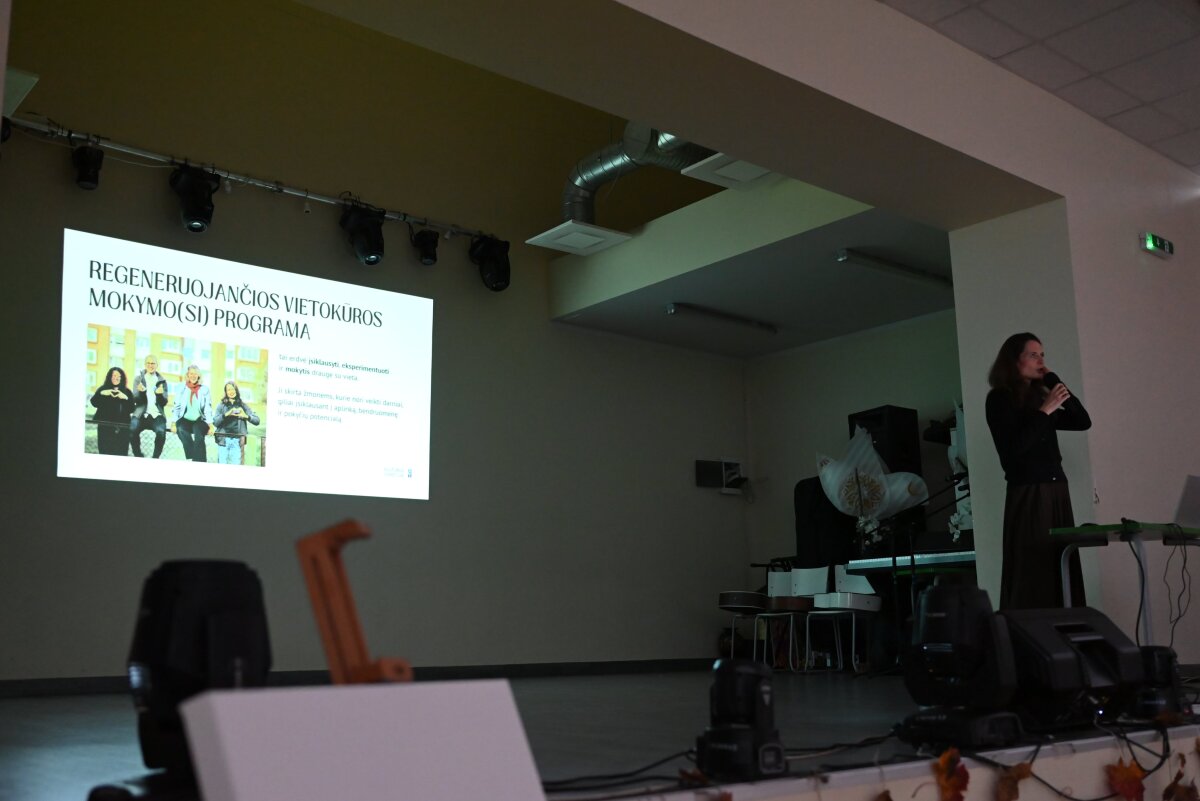 Spalio 31 d. aktų salėje vyko renginys, kuriame pristatyti ir įgyvendinti kitų dviejų komandų eksperimentai. Renginį pradėjo etnokultūros būrelis „Etnoženklai“. Apie Regeneruojančios vietokūros programą, jos tikslus, nuveiktus darbus papasakojo VŠĮ „Kultūros dirbtuvės“ direktorė Evelina Šimkutė.