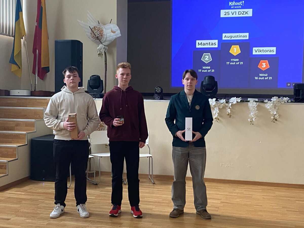 Ypač aktyvūs ir smalsūs buvo trys mokiniai, kurie parodė puikias žinias ir užėmė garbingas prizines vietas. Pirmąją vietą laimėjo Ib klasės mokinys Augustinas Slabada, jam pritrūko 1 taško iki bekonkursinio patekimo į antrąjį etapą. Antroji vieta atiteko Mantui Krikštuliui (IIIb kl.), o trečiąją vietą iškovojo Viktoras Vaškinėlis (IIIb kl.). Visi trys nugalėtojai buvo apdovanoti Seimo atstovų įsteigtais prizais.