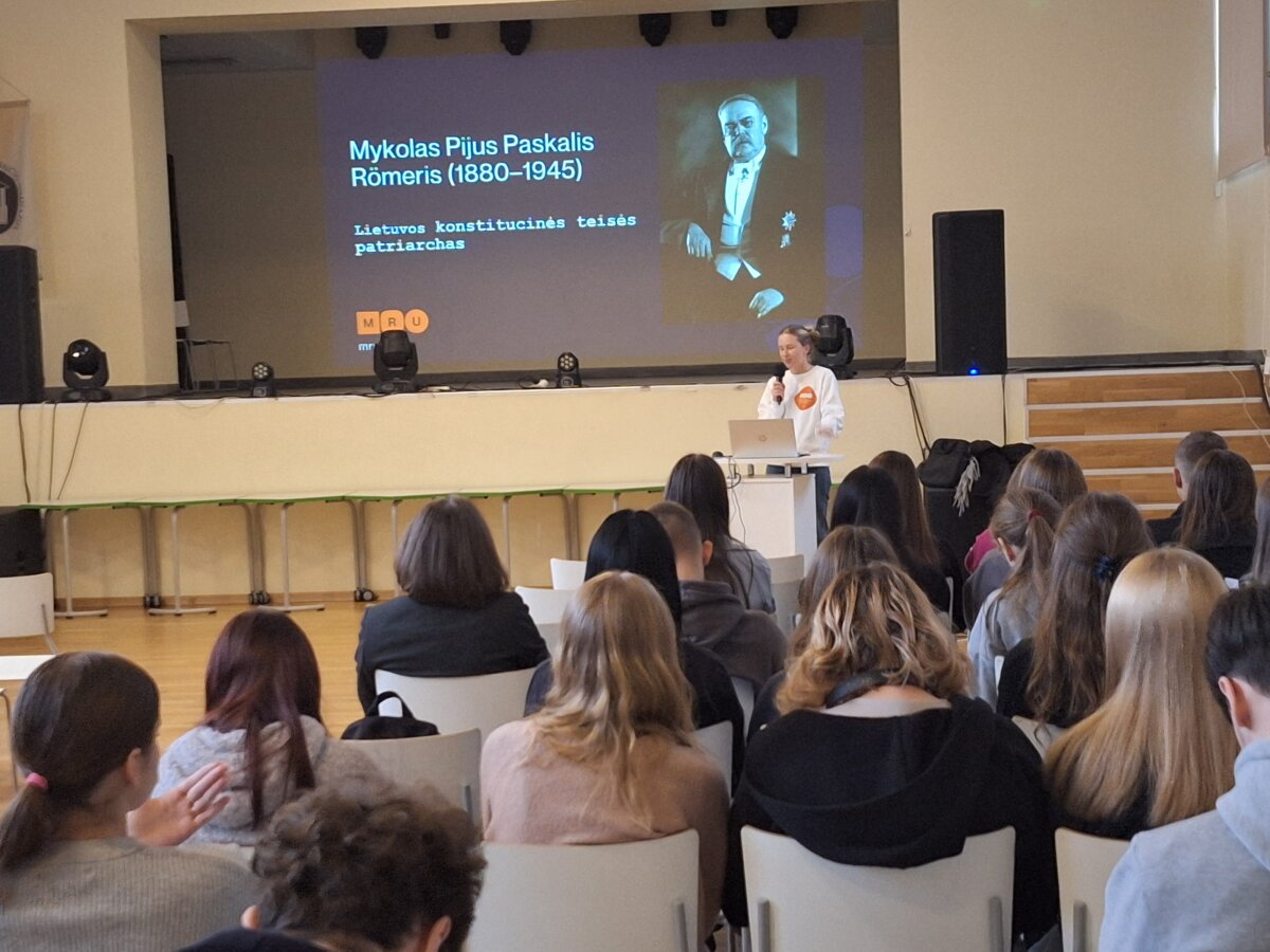 Lapkričio 19 d. gimnazijoje lankėsi Mykolo Romerio universiteto studentų priėmimo centro vyresnioji vadybininkė Inga Asauskaitė. Viešnia susitiko su II–IV gimnazijos klasių mokiniais. Klausydamiesi Ingos Asauskaitės pasakojimo, mokiniai sužinojo, kokios yra MRU studijų programos, kaip sudaromas konkursinis balas bei kokios galimybės atsiveria pasirinkus tarptautiškumu pasižyminčias studijas (pusę mokymosi laiko studentai praleidžia užsienyje). Ne vieną nustebino ir tai, kad nemažai žinomų Lietuvos žmonių savo karjeros kelią pradėjo būtent šiame universitete. Viešnia papasakojo ir apie spalvingą universiteto bendruomeninį gyvenimą – sporto, savanorystės, projektų bei aktyvaus laisvalaikio galimybes, kurios padeda ne tik mokytis, bet ir augti kaip asmenybėms. Tikėtina, kad šis susitikimas tapo įkvėpimo kibirkštimi ne vienam gimnazistui, pradedančiam ieškoti savo būsimos profesijos krypties.