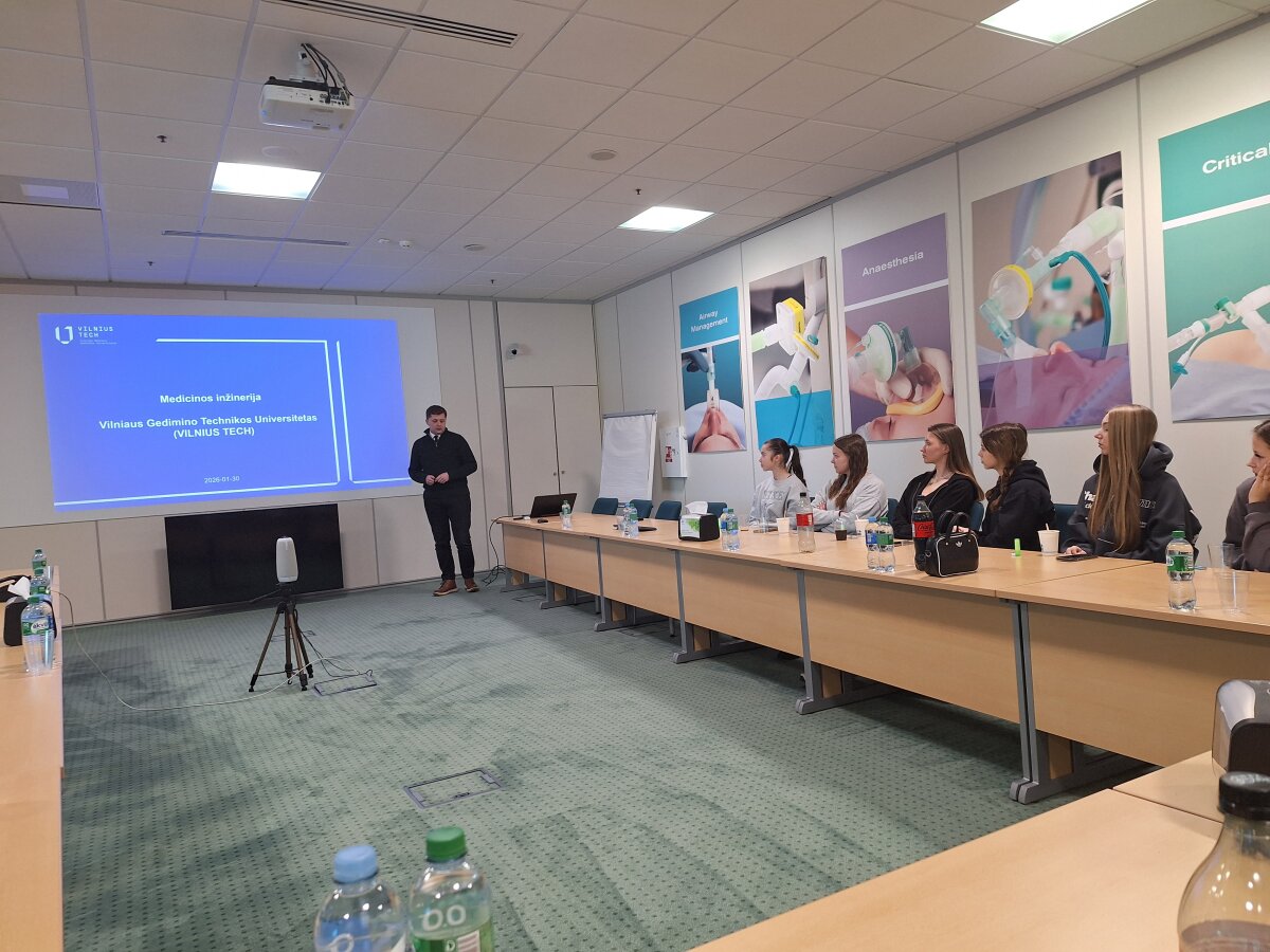 Vizito metu su gimnazistais taip pat susitiko Vilnius TECH dėstytojas Dovydas Cicėnas, dirbantis šioje įmonėje. Jis pristatė universitetą, medicinos inžinerijos studijų programą bei papasakojo apie savo karjeros kelią.